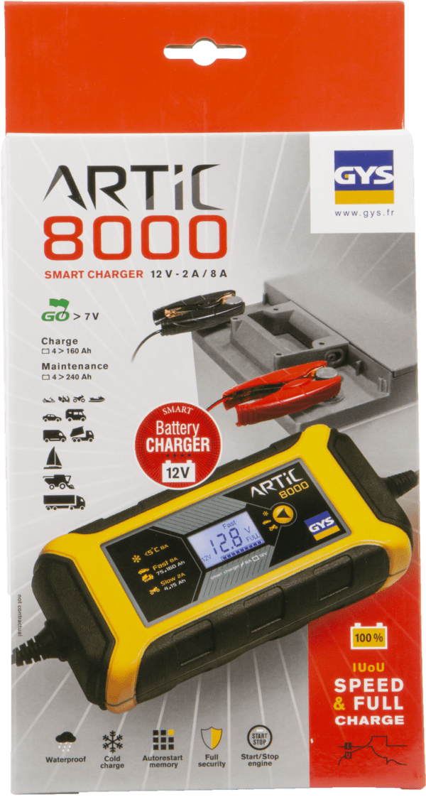 De ARTIC 8000 (8 A) acculader is speciaal ontworpen voor het opladen van 12 V accu’s van alle soorten motoren, boten, auto’s, bedrijfsauto’s en campers